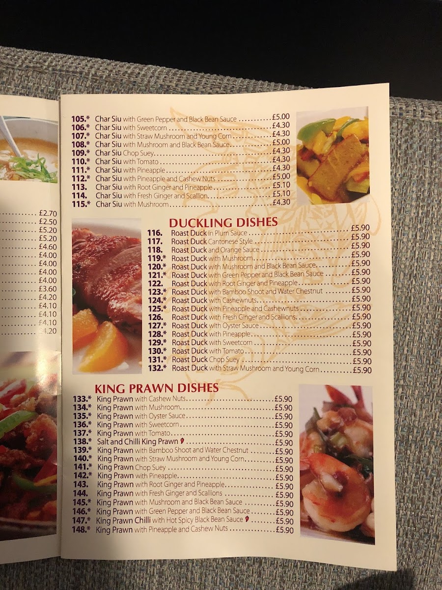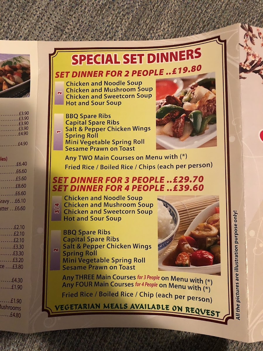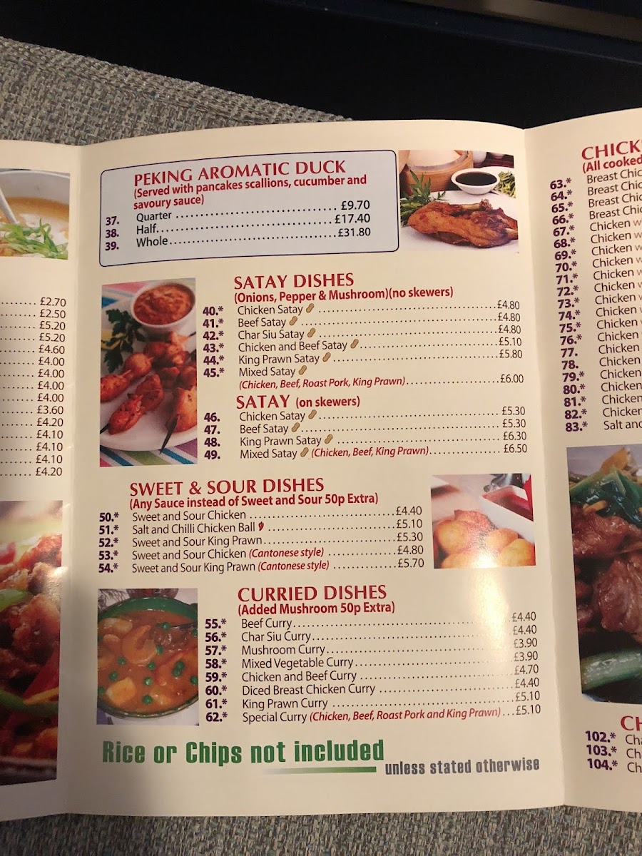The menu at Jasmine Chinese Takeaway offers an extensive variety of delicious options suitable for different tastes and preferences. The set dinners cater to groups with choices like the Set Dinner For 2 Persons, Set Dinner For 3 Persons, and Set Dinner For 4 Persons, perfect for sharing. Appetizers range from the crispy Spring Rolls (2) and Mini Vegetable Spring Rolls (10) to the savory Capital Spare Ribs and Salt & Pepper Ribs. For satay lovers, the restaurant offers both skewered and non-skewered options, including Chicken Satay, Beef Satay, and King Prawns Satay On Skewers. The Sweet & Sour dishes, such as Sweet & Sour Chicken and Sweet & Sour King Prawns Cantonese Style, are also standout choices. Curry enthusiasts can indulge in hearty Beef Curry or Mixed Vegetable Curry, while chicken fans will appreciate options like Breast Chicken With Lemon Sauce and Chicken With Cashew Nuts. For beef lovers, there’s the Beef With Cashew Nuts and Beef With Oyster Sauce. The King Prawn Dishes, such as King Prawns With Sweetcorn and King Prawns With Mushrooms, offer flavorful alternatives. The Duckling Dishes provide an extra touch of luxury with choices like Roast Duck In Plum Sauce and Roast Duck Cantonese Style. Additionally, the menu features comfort classics like Chicken Omelette and Char Siu Fried Rice, along with hearty soups like Chicken & Noodles Soup and Hot & Sour Soup. For something special, the Peking Aromatic Duck and Kung Po dishes, like Kung Po Chicken and Kung Po King Prawns, deliver bold and spicy flavors. With extra portions like Fried Mushrooms and refreshing drinks like Coca Cola Original and Diet Irn Bru, Jasmine Chinese Takeaway provides an all-encompassing dining experience sure to satisfy a variety of appetites.